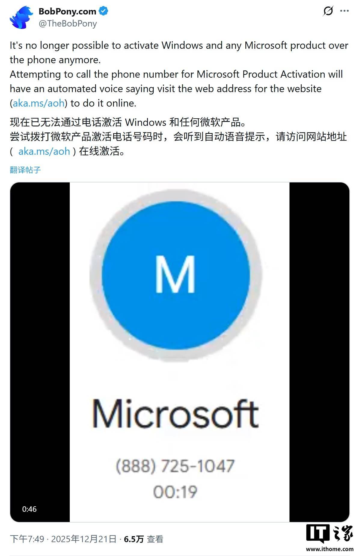IT之家 12 月 24 日音书,音书源 @TheBobPony 于 12 月 21 日在 X 平台发布推文,爆料称微软已悄然拒绝对 Windows 及旗下总共软件居品的电话激活做事,这一始于 Windows XP 时间的经典考证神色认真谢幕。