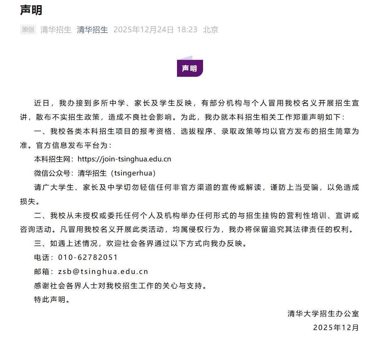 12月24日,“清华招生”微信公众号发布声明: